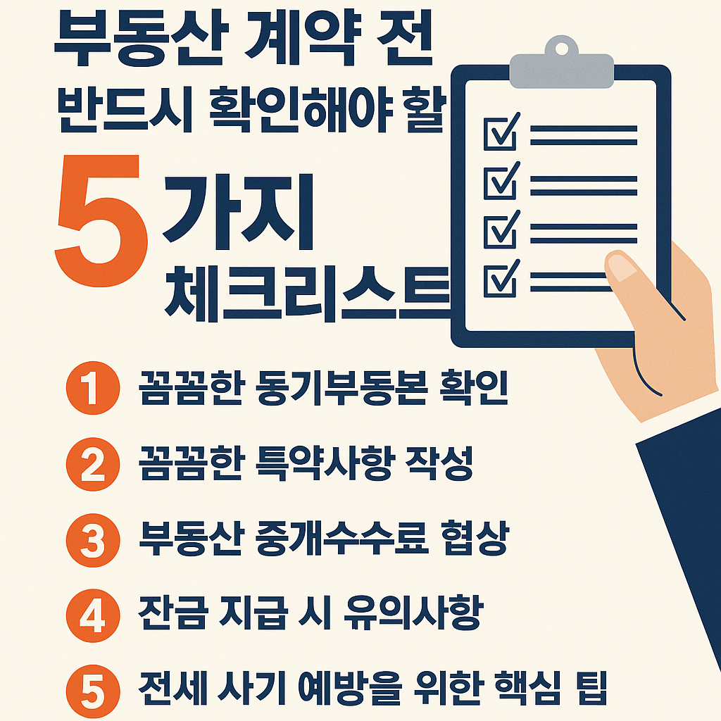 오늘은 여러분이 후회 없는 부동산 계약을 할 수 있도록, 반드시 확인해야 할 5가지 체크리스트를 알려드릴게요. 이 내용만 잘 숙지하셔도 부동산 사기나 분쟁을 피하고 안전한 거래를 할 수 있을 겁니다.